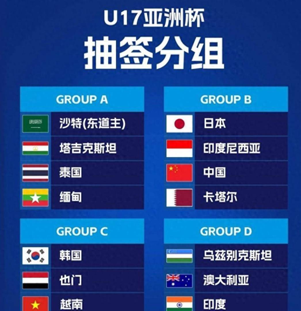 时间回溯到2026年2月12日,在马来西亚吉隆坡的亚足联总部,备受瞩目的分组抽签仪式隆重举行。根据过去三届U17亚洲杯的成绩加权,各参赛队伍被划分为四个档次,中国队位列第三档。最终,抽签结果将中国队分在了B组,同组的对手包括第一档的劲旅日本队、第二档的东道主印度尼西亚队以及第四档的卡塔尔队。其他小组的分布情况如下:A组为沙特阿拉伯、塔吉克斯坦、泰国和缅甸;C组由韩国、也门、越南和阿联酋组成;D组则包括乌兹别克斯坦、澳大利亚、印度和朝鲜。